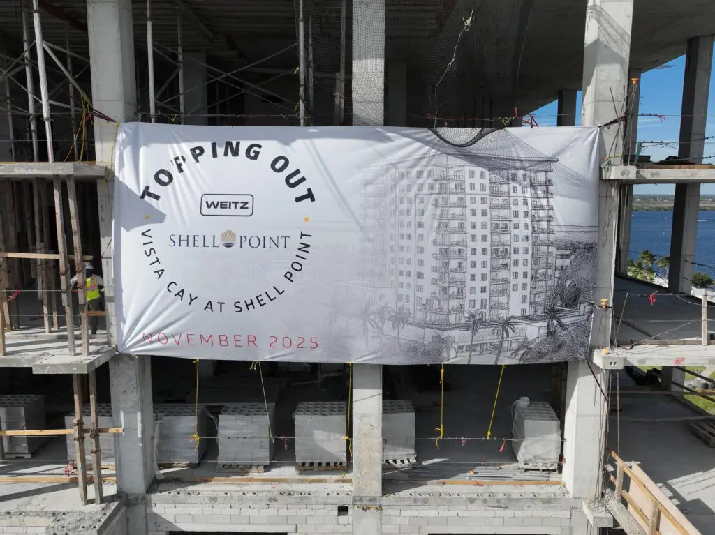 The Weitz Company is proud to celebrate a major milestone in the construction of Shell Point Tower One – Vista Cay, marking the official topping out of this 14-story Independent Living tower at the Shell Point Retirement Community in Fort Myers, Florida.
